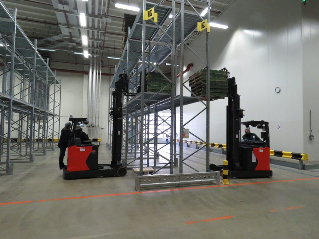 The drivers must acquire other skills. Thus, the reachtrucks can reach as high as three racking levels. A normal forklift truck can only reach two levels. Thanks to the KOOI-REACHFORKS®, the hydraulic extendable forks, the drivers can deposit the pallets of vegetables and fruit two positions deep. Therefore, a camera is placed at the top of the reach truck. A second camera is located on the side of the outer sleeves of the KOOI-Forks, which are pushed into the openings of the pallets, and in this way the driver can see where the pallet is.