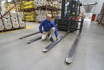 A visit to a company who were already using the KOOI hydraulic telescoping forks brought the decision that much closer. Brown saw for himself how KOOI-ReachForks provide a practical method of doubling fork lengths when required. “We don’t want to be driving around with fixed 2400 mm long forks on the trucks”, he explains. “With no load in place that is downright dangerous. In any case, we don’t have the space for a truck with those dimensions inside the production rooms.” MSE-Forks fabricated the telescopic forks and, working with their dealer in the Netherlands, forklift attachment specialists Griptech BV, supplied a fully-operational multi load handler system. These can be adjusted to any desired width, allowing a single truck unit to pick up one, two or four pallets. The first telescopic forks were taken into use by Isover in 2006 for a period of intensive testing. Roy Brown: “They worked fine, but guiding them in and out of the pallets took some skill. This was mainly down to their thickness and shape. The inner and outer forks weren’t completely flush, so the forks occasionally got stuck under the pallet.”
