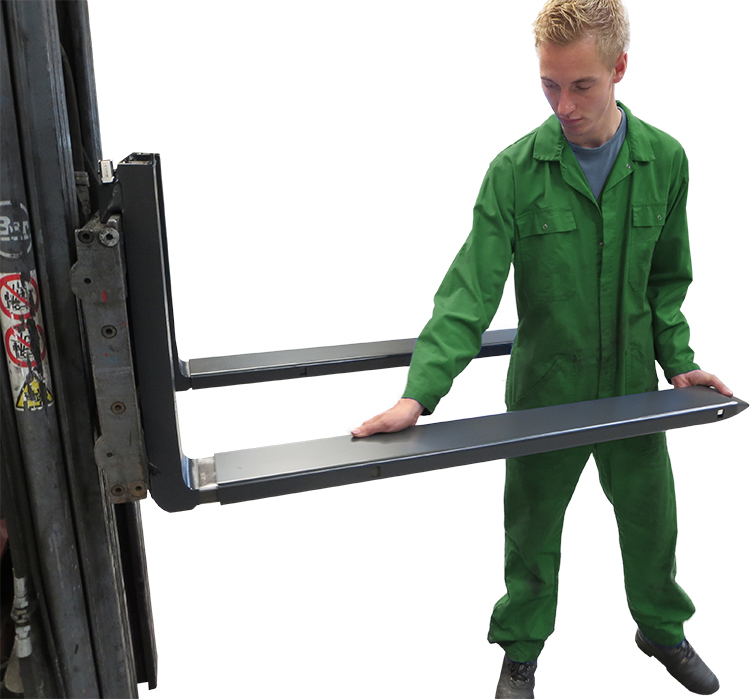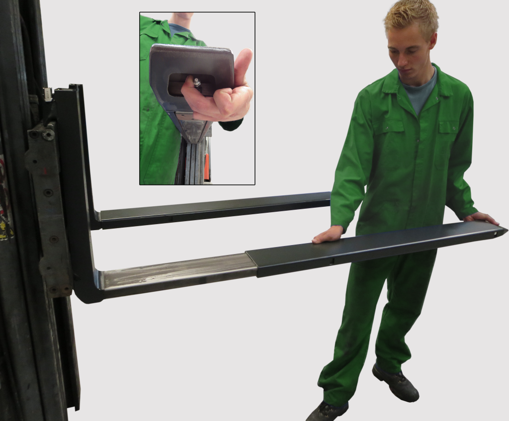 MSE-Forks offers Manual KOOI-REACHFORKS ® as an alternative to loose extensions. What distinguishes these unique forks (patent pending) is that they don’t have any loose parts. Also, the manual extendable forks stay on the forklift truck permanently, saving time, space and money as compared with traditional loose fork extensions. The manner of adjusting the outer sleeves is highly innovative. It simply involves moving a pin (which also serves as a grease nipple) sideways, causing the locking device to be retracted. As soon as the locking device is disengaged, the outer sleeves can be moved, using the other hand, until the locking device engages again at the different length.