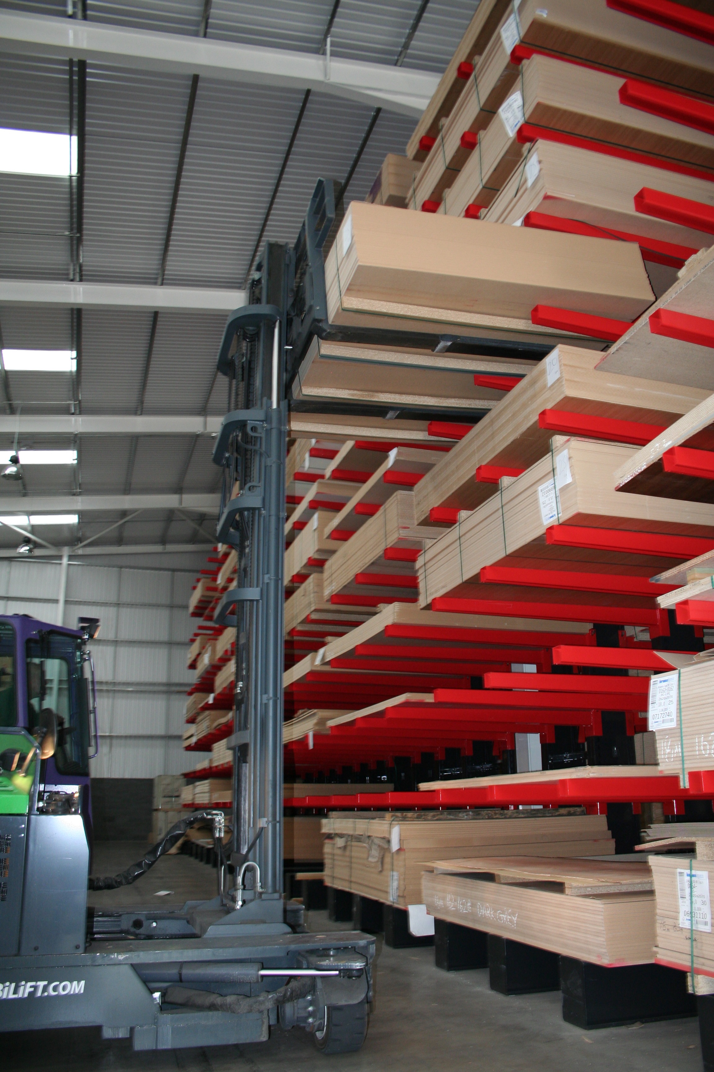 The KOOI® ReachForks fitted to the C4000 4t capacity Combilift are attached to a hydraulic forkpositioner and are operated from within the cab for convenient adjustment by the driver. The forks easily extend across the truck bed for loading and unloading HGV’s, and make light work of lifting the packs up to 5m for storing in cantilever racking in the warehouse. The racking designated for the packs of MDF is also deeper than standard, in accordance with the depth of the panels, and once the load is in place, the forks can be retracted to enable the forklift to travel down other narrow aisles between racking, allowing for optimum storage density in the 12,000m² building. The combination of the Combilift 4-way ability and the KOOI® ReachForks has ensured the stable transportation of what was potentially a problematic load, and has given Latham’s an operational flexibility second to none.