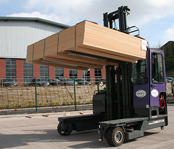 One of Combilift’s earliest customers was Lathams Ltd, a family business now in its 251st year of operation, and a leading importer and distributor of wood based sheet materials. Combilift fleets have been in operation at Latham depots (10 in all) across the UK since 2001, and have enabled these sites to maximise the amount of stock stored. KOOI® ReachForks are used on a number of Latham’s Combilifts due to the extreme size of some of the products it stocks. At the company’s newly relocated base in Dudley near Birmingham, these forks come into their own when handling one specific load – very large panels of MDF.